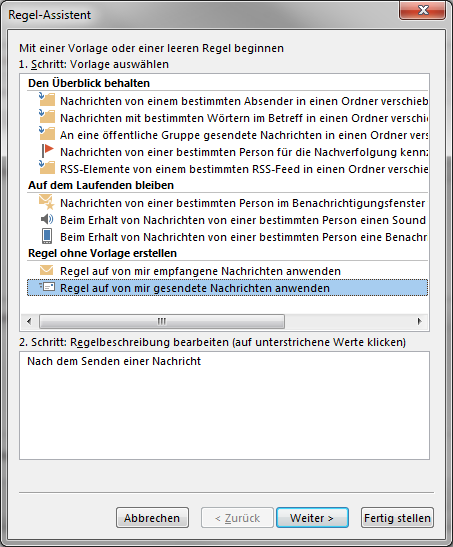 Zuerst einmal ist das in outlook 2013, sowie in outlook 2016 möglich. Zuerst einmal ist das in outlook 2013, sowie in outlook 2016 möglich. Klicken sie unter regel ohne vorlage erstellen auf regel auf von mir empfangene nachrichten anwenden, und klicken sie dann auf weiter. In outlook 2013 gehen sie dabei wie folgt vor: Aktivieren sie die checkbox vor über konto kontoname.